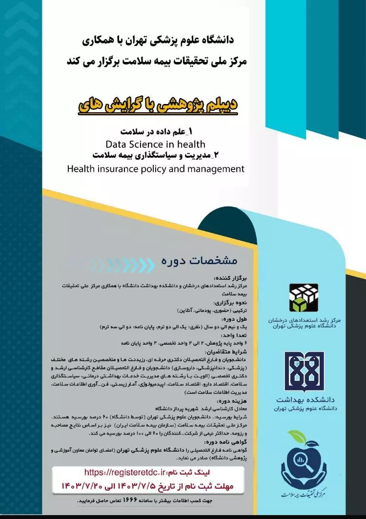با توجه به پوشش بیمهای بیش از نیمی از جمعیت کشور توسط سازمان بیمه سلامت ایران و حجم عظیمی از دادههای خدمات سلامت این بیمهشدگان در این سازمان که منبع ارزشمندی برای تولید شواهدی علمی در تصمیمات سیاستگذاران است لذا به منظور استفاده از ظرفیت دانشجویان / فارغ التحصیلان نخبه رشتههای علوم پزشکی و سایر رشتهها و انجام پژوهشهای بنیادی، توسعهای و کاربردی در حوزه بیمه سلامت با استفاده از ظرفیت این سرمایههای کشور، برگزاری" دوره دیپلم پژوهشی " با همکاری دانشگاه علوم پزشکی تهران و مرکز ملی تحقیقات بیمه سلامت برنامهریزی شده است.