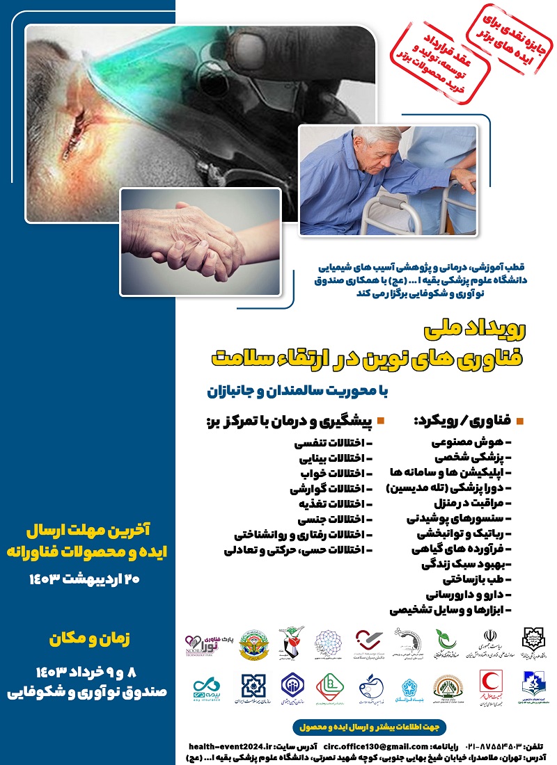 این رویداد توسط قطب آموزشی، درمانی و پژوهشی آسیب های شیمیایی دانشگاه علوم پزشکی بقیه ا... (عج) با همکاری صندوق نوآوری و شکوفایی برگزار می شود.